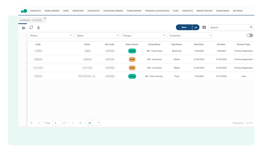 Manage all sites under a dynamic and customised model to cover all the reality of a site. It includes an innovative feature to visualise the sites located in a map, acess information in real time and manage contract renegotiations.